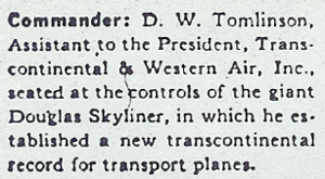 "THE SKY'S THE LIMIT" written by Tomlinson in 1930, but for Tommy... the sky was not the limit. Naval Air Transport WWII... Know as a Champion Flyer of the 1920s, Famous High Altitude Test Pilot of the 1930s...Engineer of the Douglas Transport, DC-1, his specs for TWA set Donald Douglas in the forefront of passenger transportation with the DC-2 and DC-3.